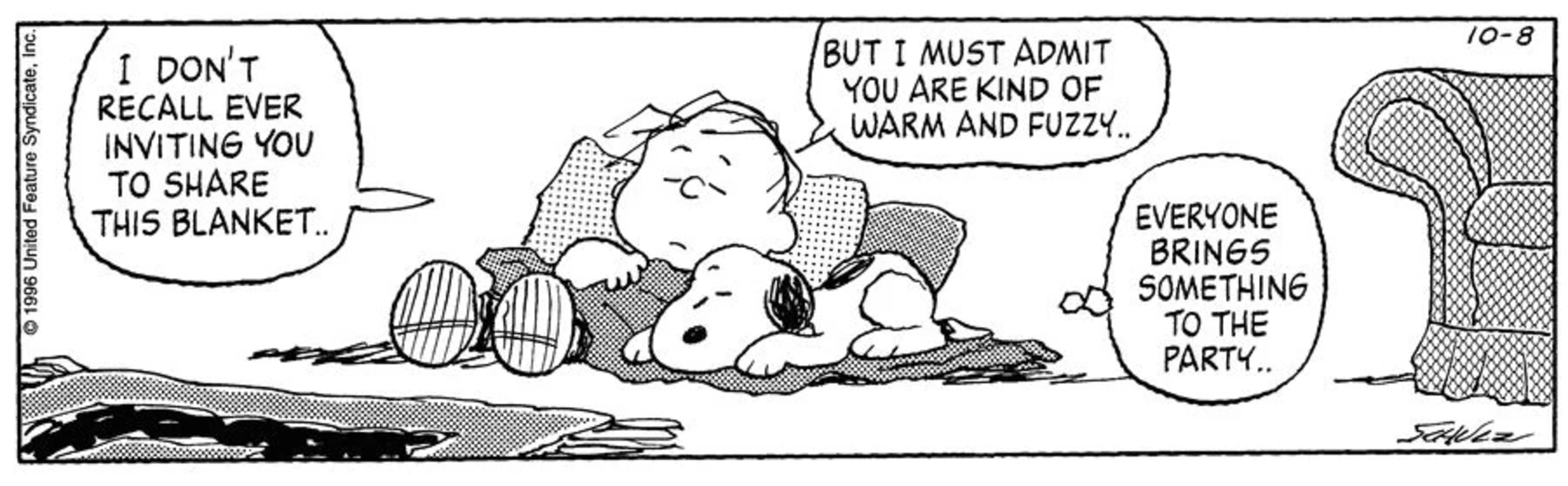 In a side - splitting storyline , Linus essay to kickhis blanket habit once and for all , so he enlists Snoopy ’s assist by asking him to keep his blanket for him and to not give it back to him under any circumstances . Snoopy relishes his new task , perhaps a small too much , take a shit full use of Linus ' cover . For instance , this strip demonstrate Snoopy definitely keeping an center on Linus ’s blanket : using it as his own personal quilt , which is not exactly what Linus had in creative thinker .